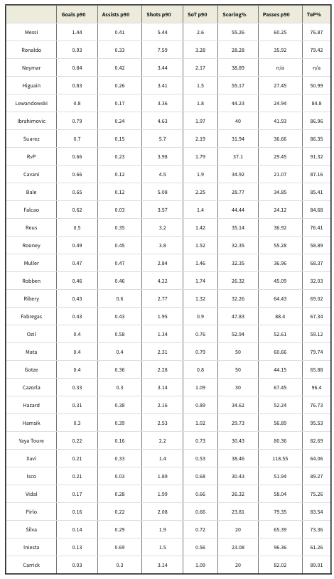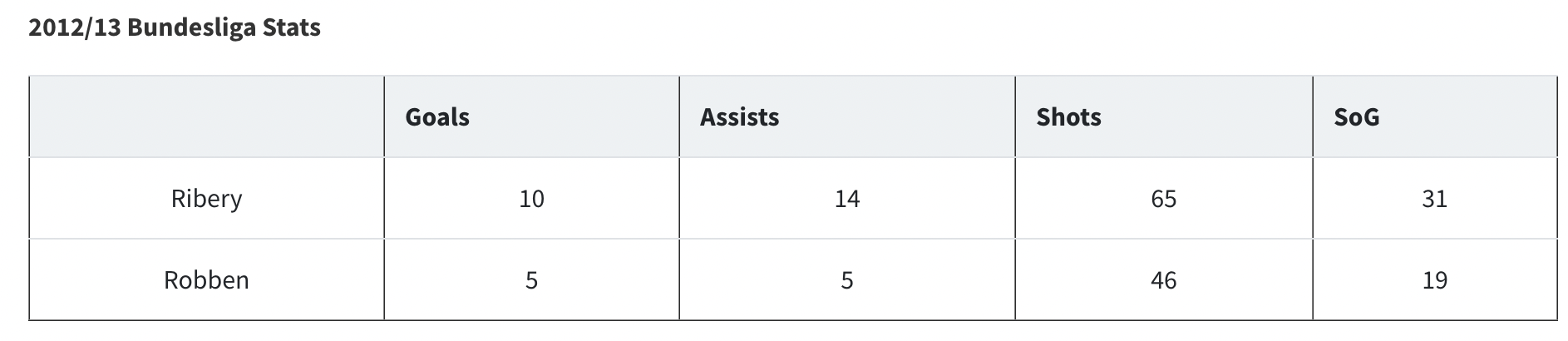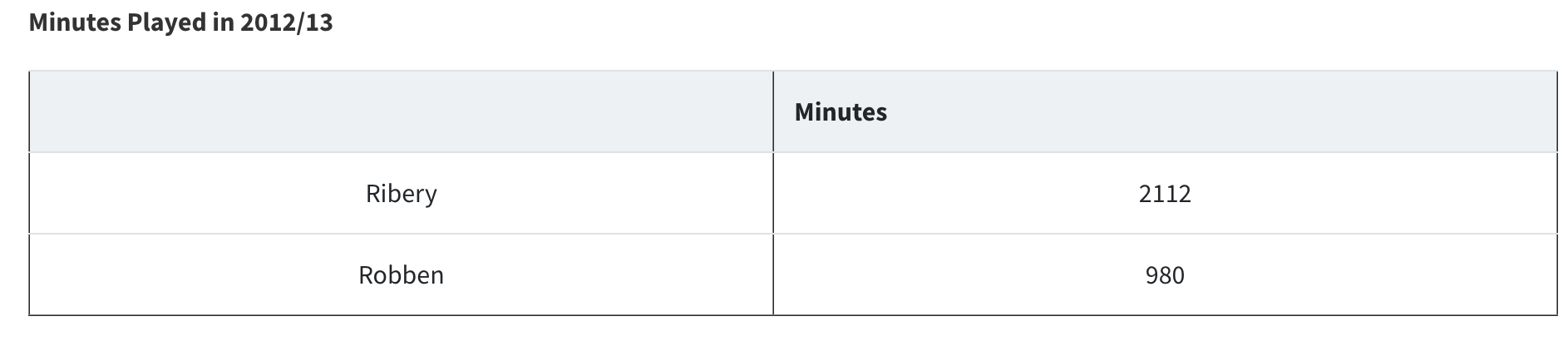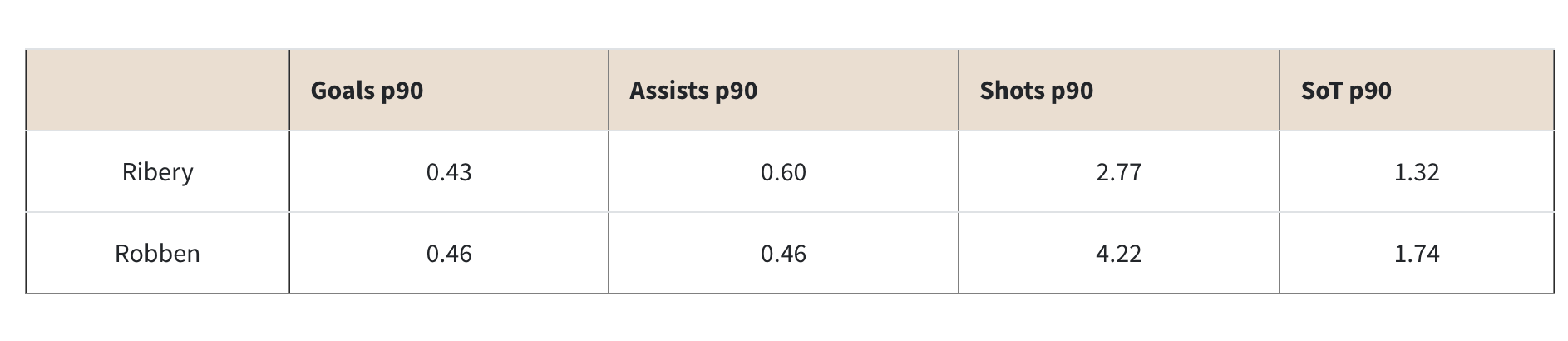 Now, once we have the added context of minutes played the first table, which features the raw numbers, just cannot be taken at face value. The minutes played table dramatically changes what we thought we knew about the gap in performance between Ribery and Robben.