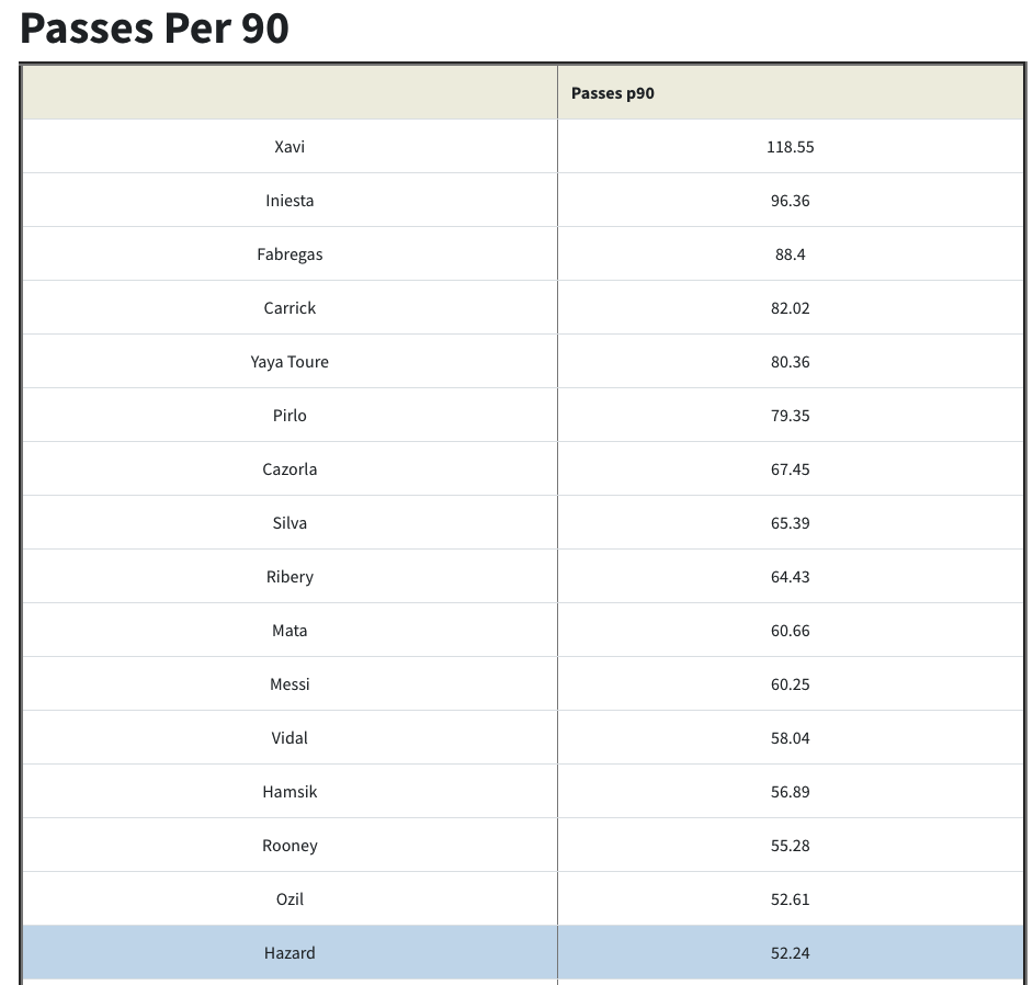 Obviously there is a Barca team effect at play here, but Xavi would post a high passes per90 in any team he played for. Carrick is high on the list, as are Toure and Andrea Pirlo.