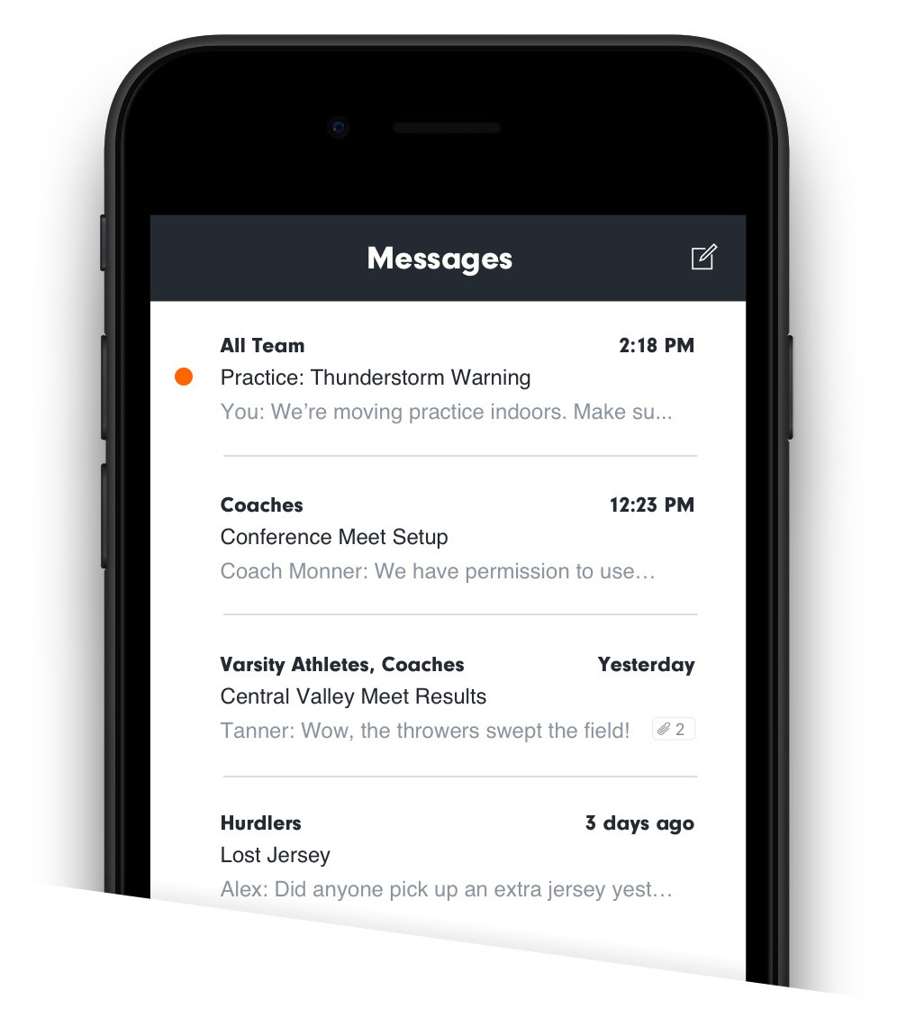 Send updates to the entire team, a select group or an individual athlete from any mobile device or computer through in-app messaging.
