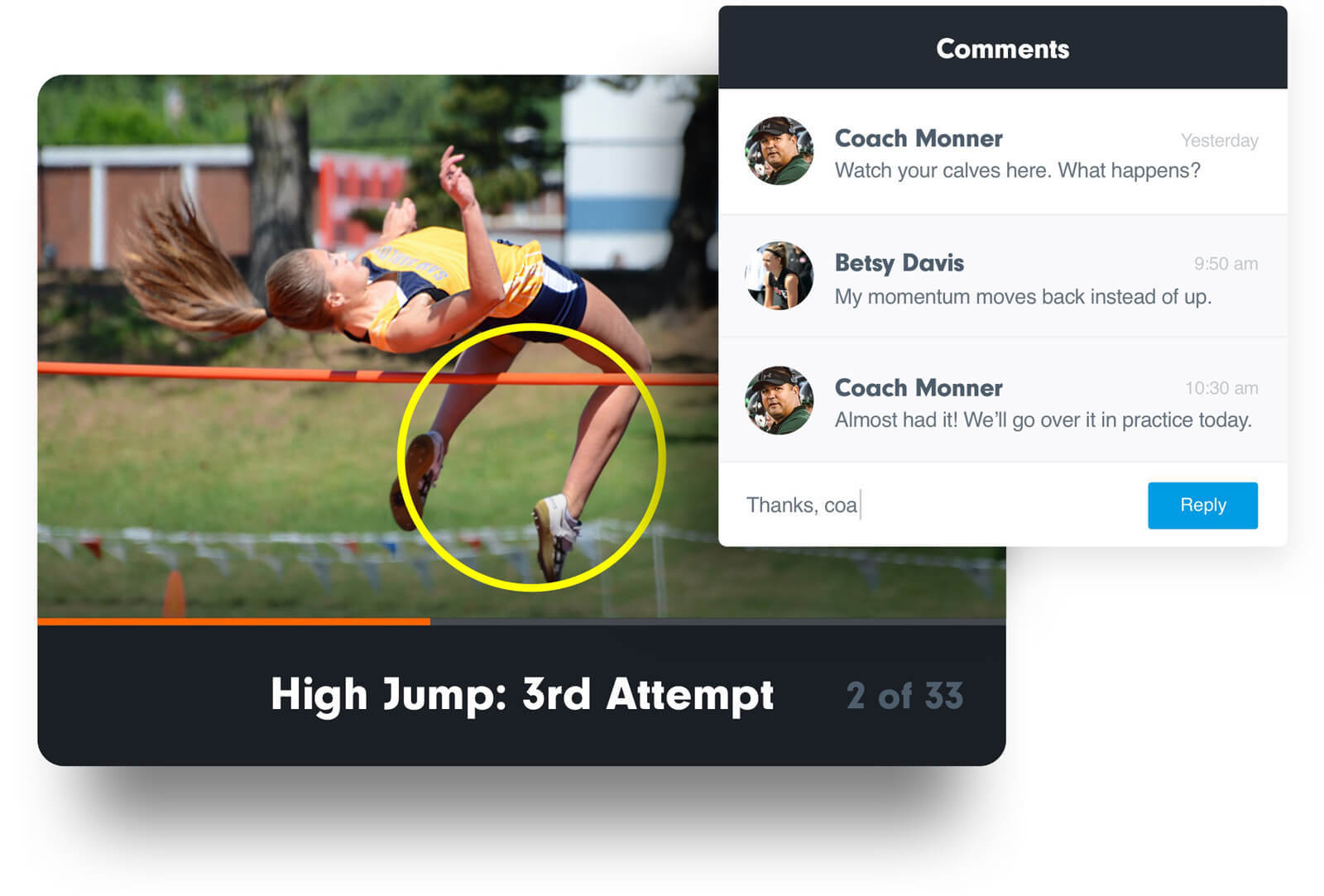 Help your athletes see exactly what needs to improve. Allow them to critique their own performance or provide personalized feedback by adding comments and drawings before sending clips for review.