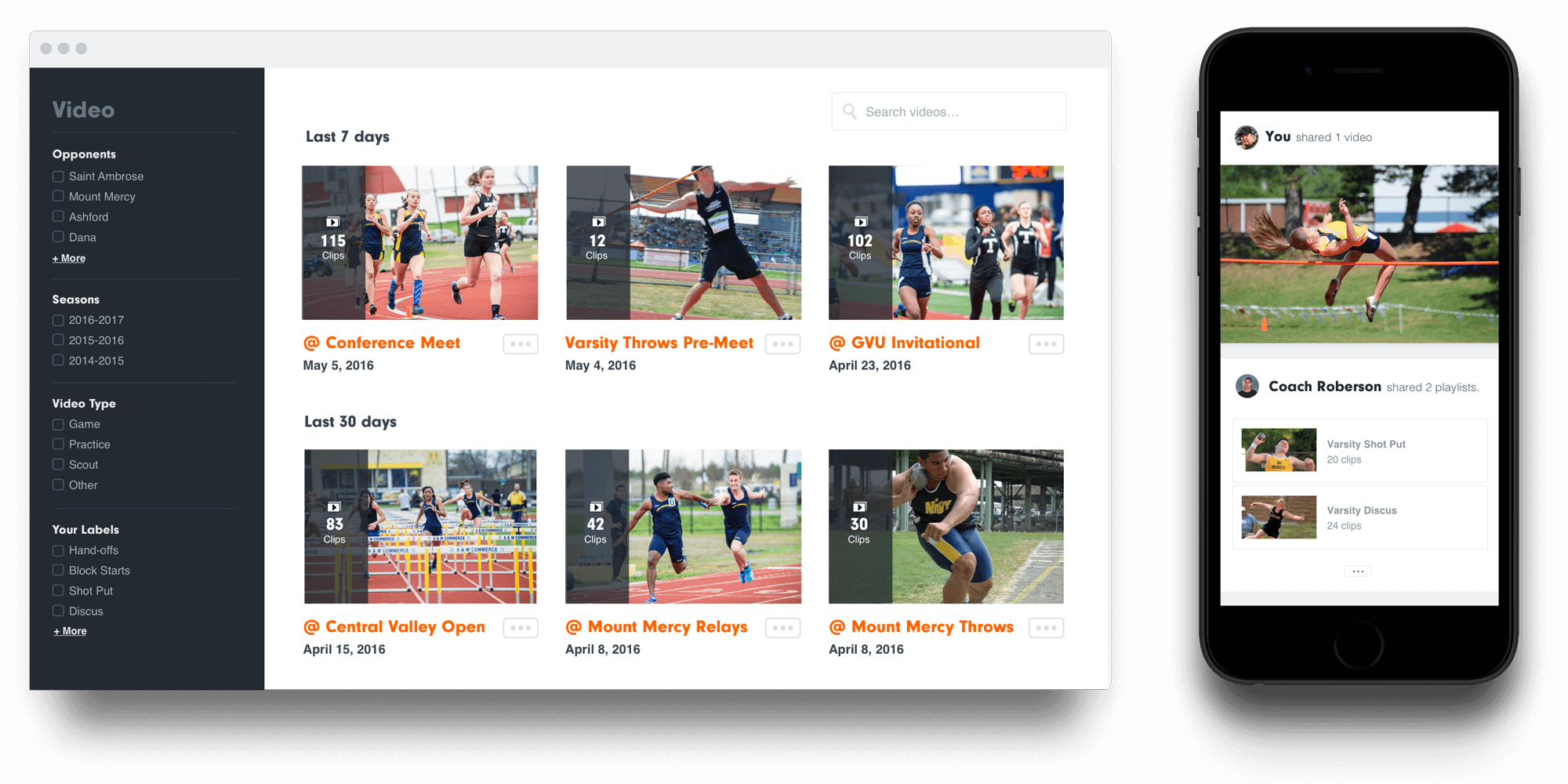 Athletes and coaches can view full meets, practice video or custom playlists from any computer or mobile device.