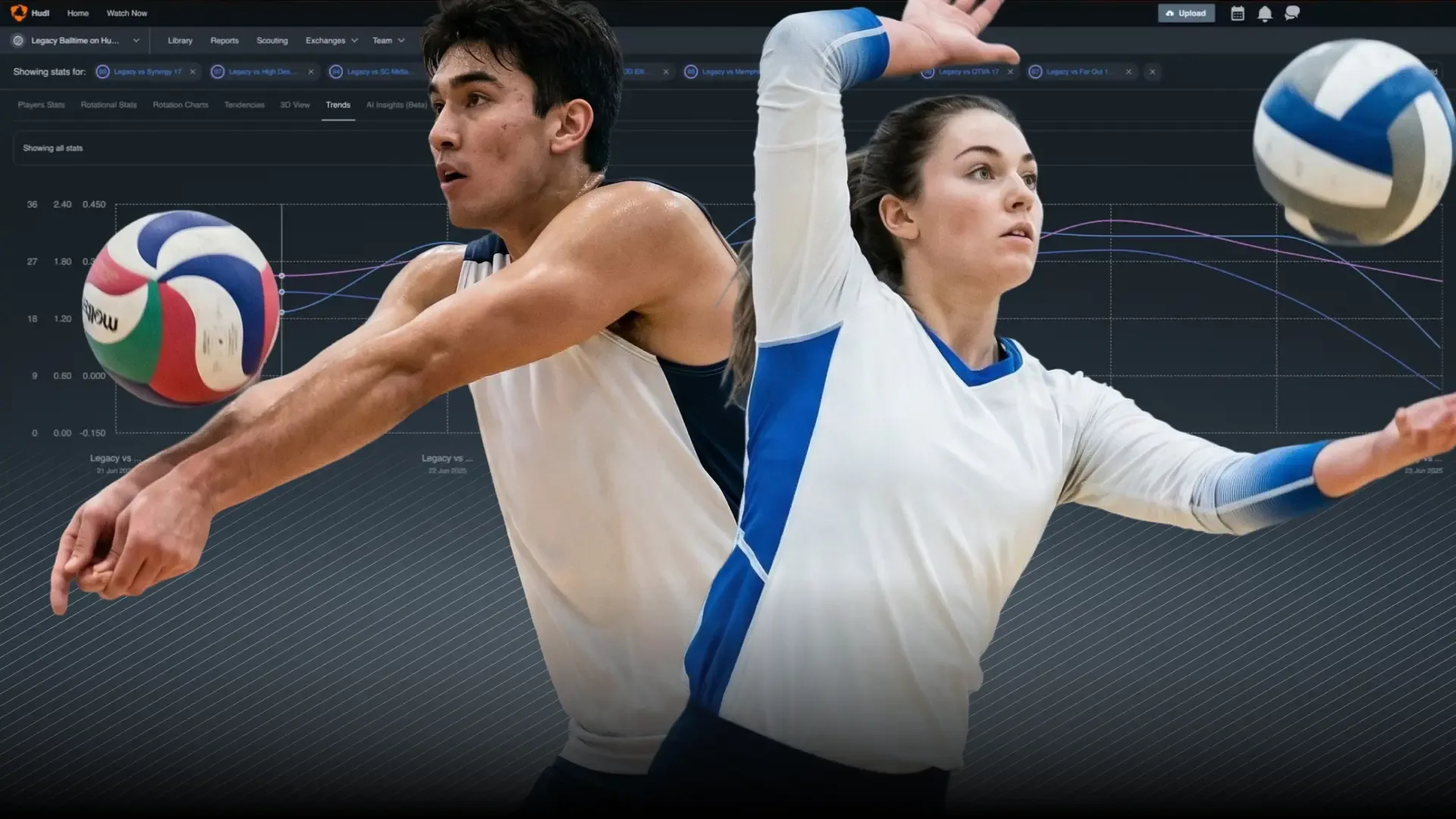 Two volleyball players, one setting a ball paired with a set trajectories stat panel, and another going in for a dig, paired with a panel that shows the speed of the ball.