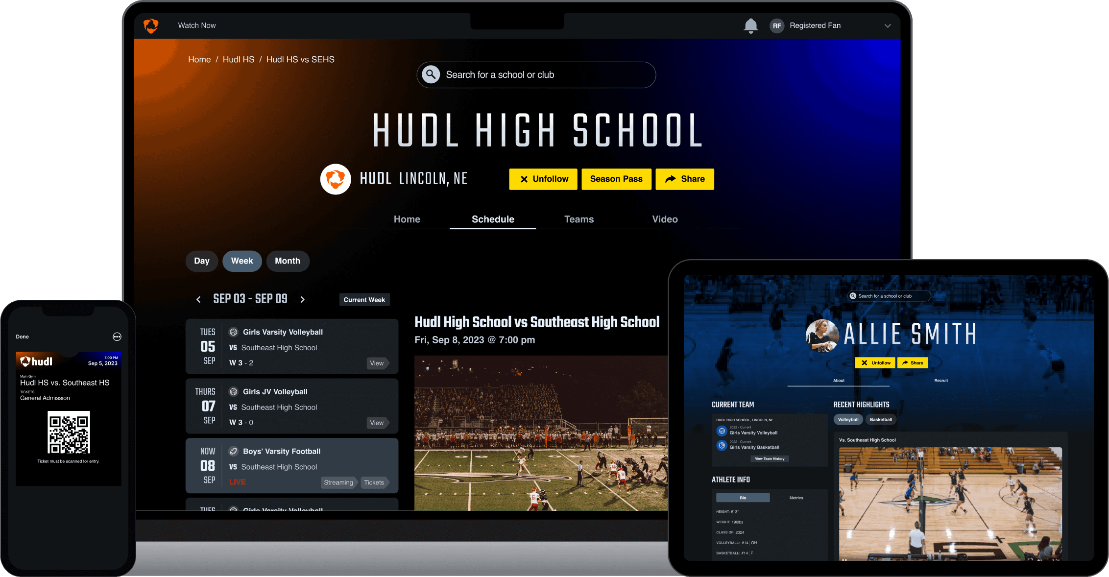 Hudl Tickets integrates seamlessly with your personalized school profile, making it easy for fans to find and for you to showcase. Tap into instant reporting and upgraded security at no additional cost. And offer season passes or pre-sale options at a price you set.