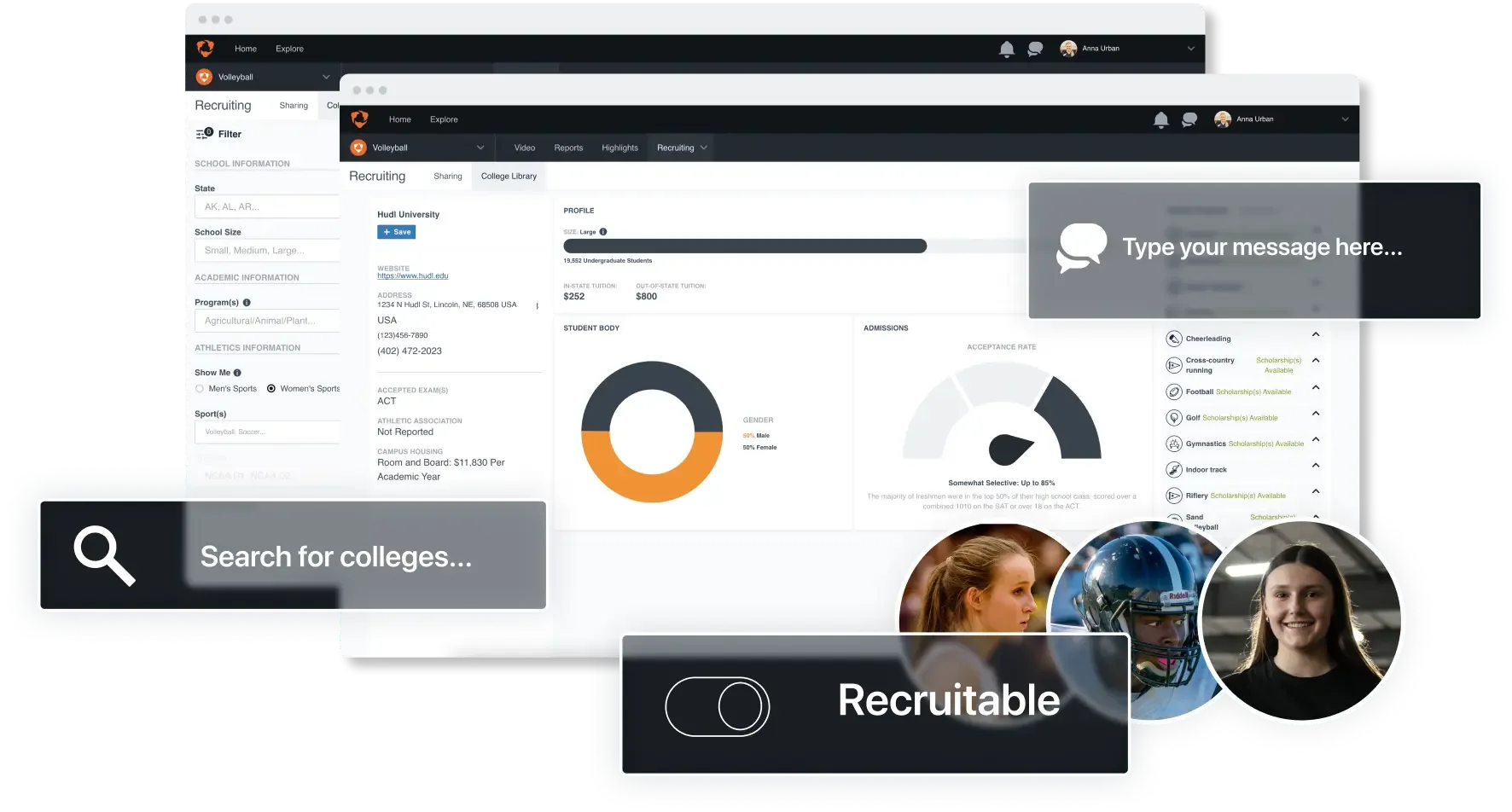 It allows your players to take the recruitment process into their own hands. Through Hudl, they can quickly find target schools, access recruiter contact information, and share highlights, academic info and more. Your players can own their journey; we’ll do the heavy lifting.